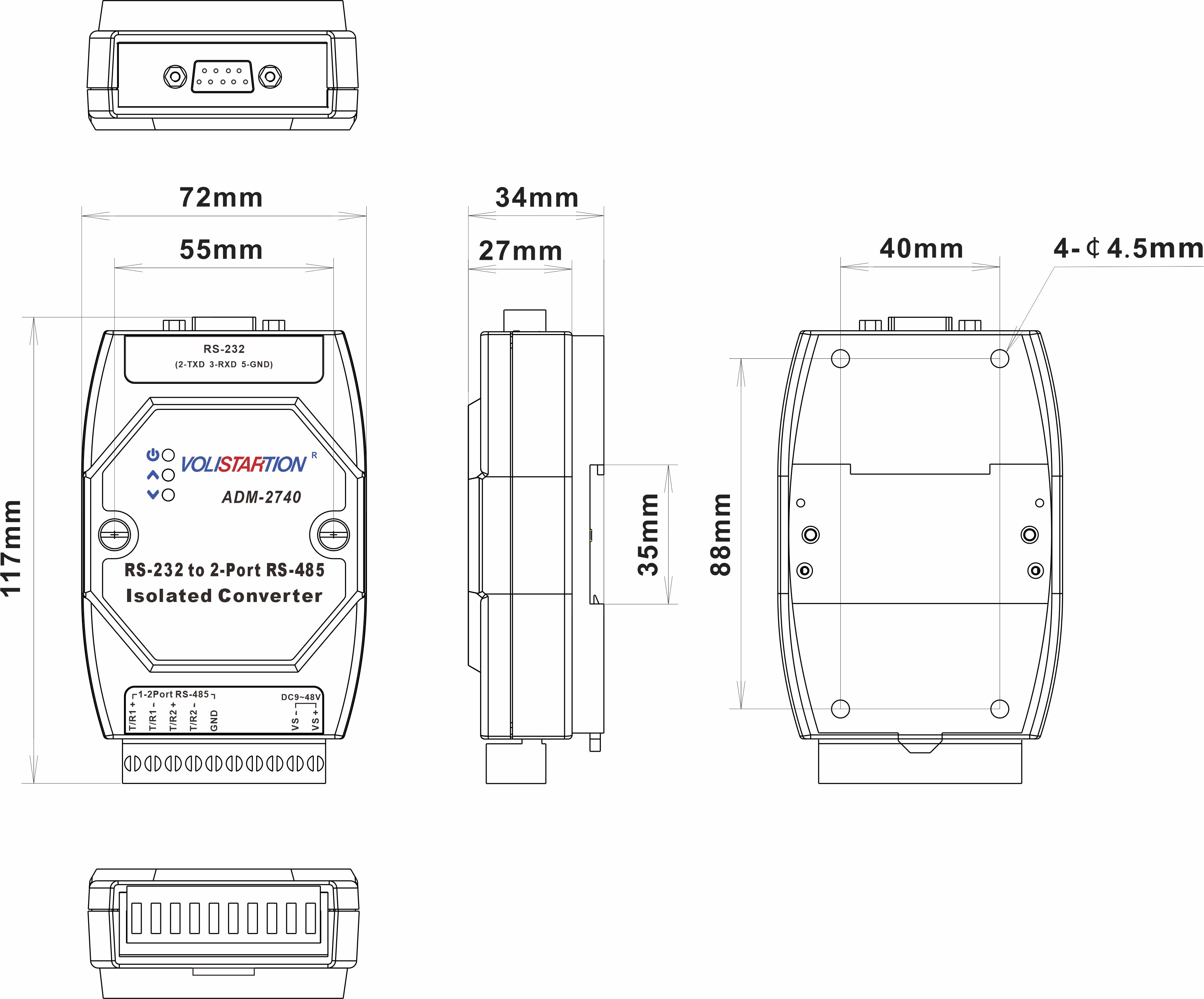 ADM-2740是一款专为工业自动化通信中,解决RS-232接口信号转换成RS-485信号的光电隔离型转换器;支持RS-232转2路RS-485,RS-232口可接主站,2个RS-485口可接从多个从站。ADM-2740支持传输速率最高达115.2Kbps,RS-485接口端采用光电隔离技术,600W 防雷浪涌保护电路,提供1.5KV 的隔离电压可以有效地抑制闪电和ESD保护。RS-485工作模式采用的判别电路能够自动感知数据流方向,并且自动的切换使能控制电路,轻松解决 RS-485 收发转换时延问题。RS-485 接口传输距离大于 1000 米、性能稳定。广泛用于高速公路收费系统,道路监控系统及电力采集系统中,是一款性能卓越,价格优良的数据接口转换产品。