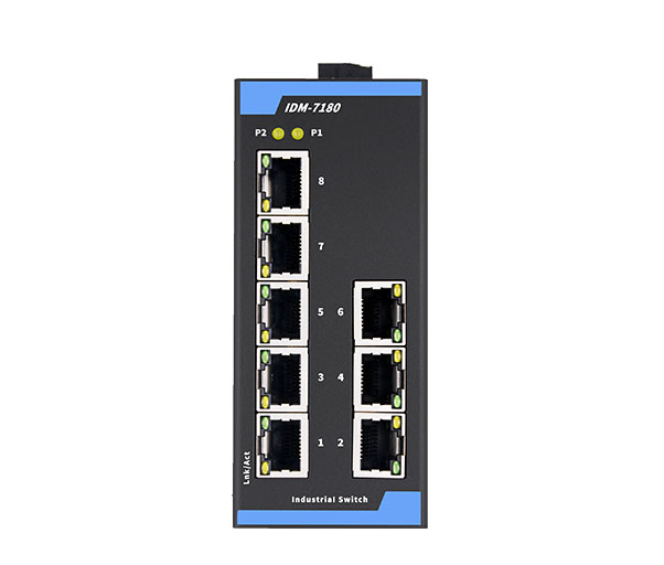The IDM-7180 industrial Ethernet switch is entry-level industrial 8-port Ethernet switch that support IEEE 802.3/802.3u/802.3x with 10/100M, full/half-duplex, MDI/MDIX auto-sensing RJ45 ports. The IDM-7180 switch is rated to operate at temperatures ranging from -20 to 75°C, and is rugged enough for any harsh industrial environment. The switches can be easily installed on a DIN-rail as well as in distribution boxes. The DIN-rail mounting, DC24V or AC24V power supply, LED indicators make the plug-and-play IDM-7180 switches easy to use and reliable.