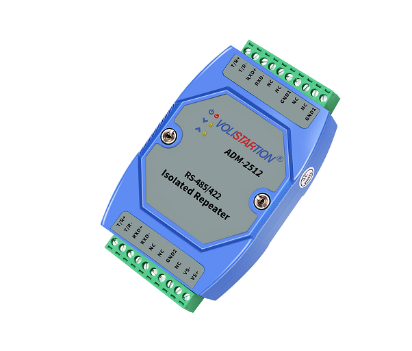 ADM-2512是一款专为解决RS-485/422信号长距离传输时,信号弱、信号易干扰问题的产品。能够延长RS-485/422总线的通信距离,增加RS-485/422网络中设备的数量,支持传输速率最高达115.2Kbps,RS-485接口端采用光电隔离技术,600W 防雷浪涌保护电路,内置三端全隔离,两端RS-485/422及电源相互隔离,提供1500V 的隔离电压可以有效地抑制闪电和ESD保护。RS-485工作模式采用的判别电路能够自动感知数据流方向,并且自动的切换使能控制电路,轻松解决 RS-485 收发转换时延问题。RS-485 接口传输距离大于 1000 米、性能稳定。广泛用于高速公路收费系统,道路监控系统及电力采集系统中,是一款性能卓越,价格优良的数据接口转换产品。